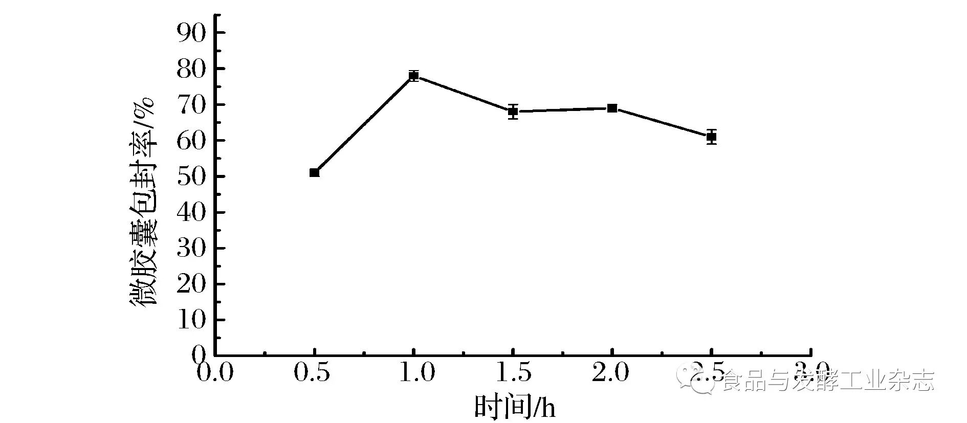 由图5可知,随着包合时间的增加,微胶囊包封率在1.0 h时最高,随后呈下降趋势,所以最适包合时间为1.0 h。分析其原因是由于包合时间短,首先使得芯材与壁材混合不够充分,部分番茄红素未被包埋,其次时间过短乙酸乙酯没有进行充分的挥发,使得芯材无法从溶剂中析出而形成微胶囊,故而包封率低。但是包合时间越长,从图5可以看出微胶囊包封率略微有所下降,分析其原因在于较长的时间,芯材的液滴直径变小,表面能变高,油滴有趋于聚合的趋势,导致包封率下降[15]。