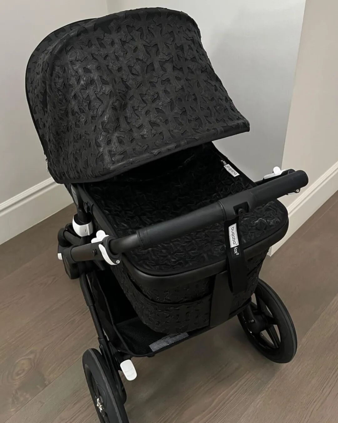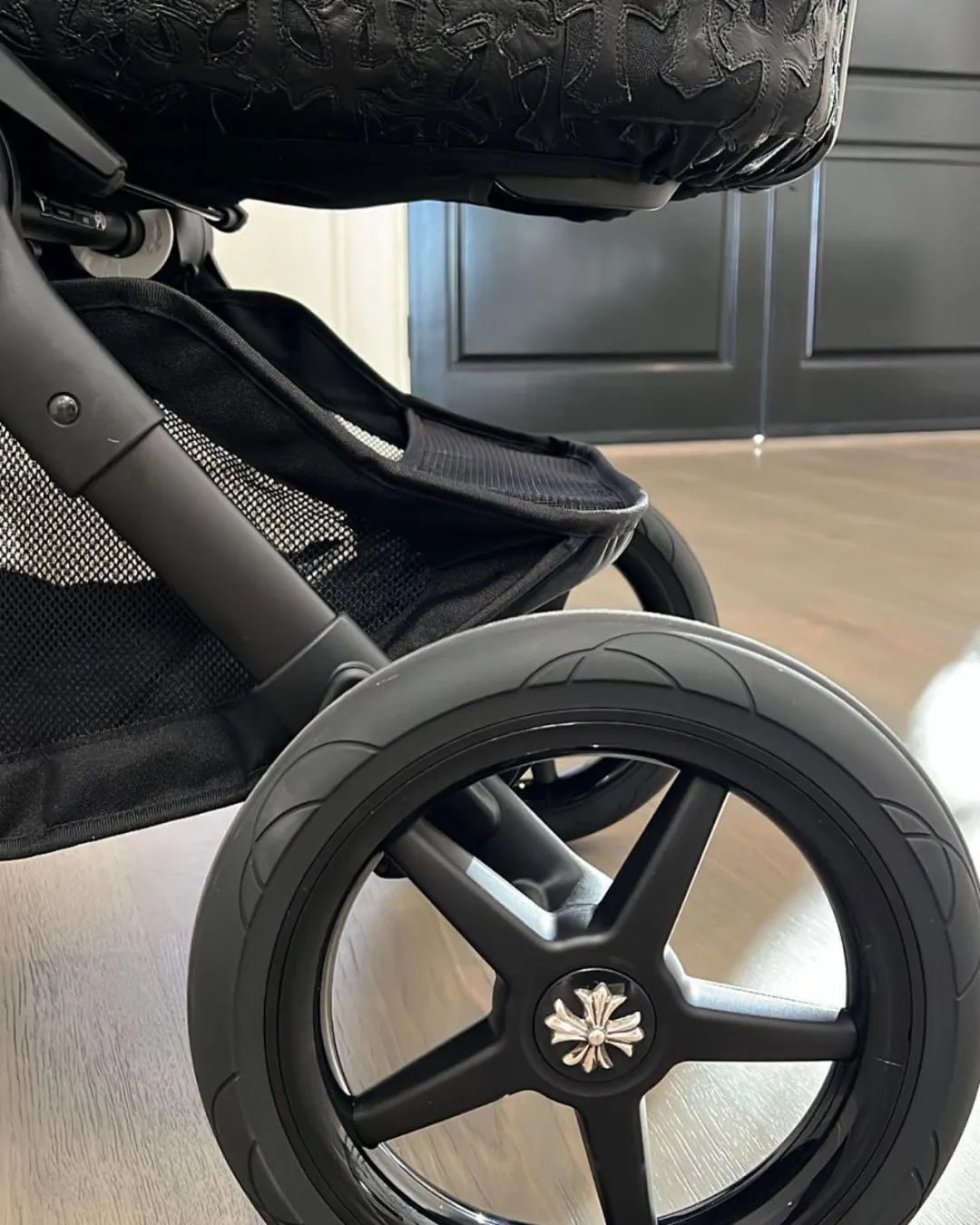 不仅仅如此,这对辣妈潮爸对宝宝更是宠爱有加。Chrome Hearts官方ins晒出他们为新生宝宝准备了极尽奢华的Chrome Hearts婴儿车。