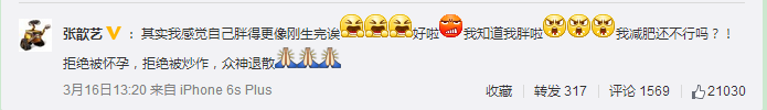 就在各路网友猜测袁弘好事将近的时候,张歆艺出来辟谣称:我知道我胖啦,我减肥还不行吗?!拒绝被怀孕,拒绝被炒作~~艾玛,这架势也是没谁了!