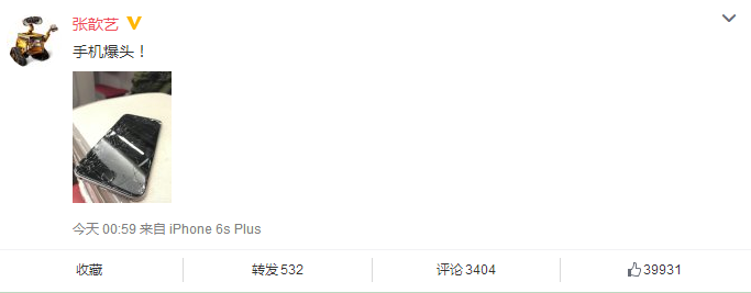 张歆艺也在凌晨简单粗暴的发博,一个破裂的手机屏,以及四个字“手机爆头”!