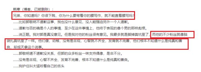 说到激动处,韩寒直接盖章,郭敬明灌输的价值观是很贱的。