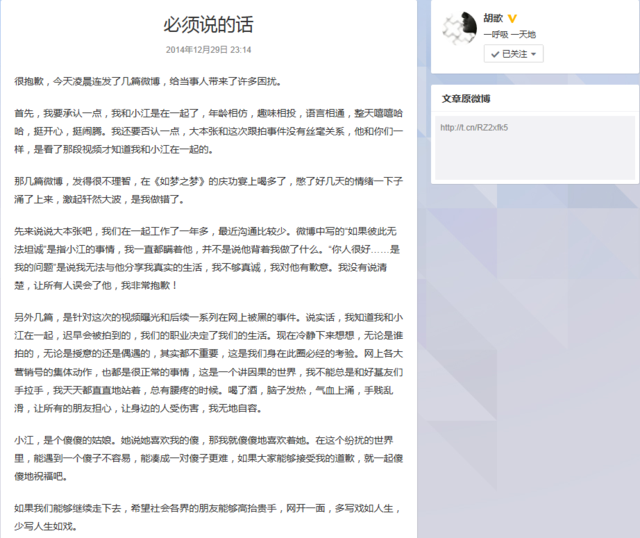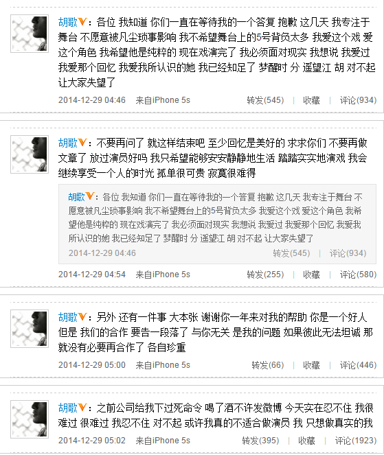 12月29日凌晨,胡歌为《如梦之梦》演出庆功醉酒后连发4条微博,先否认恋情,后又说爱过但分手了。