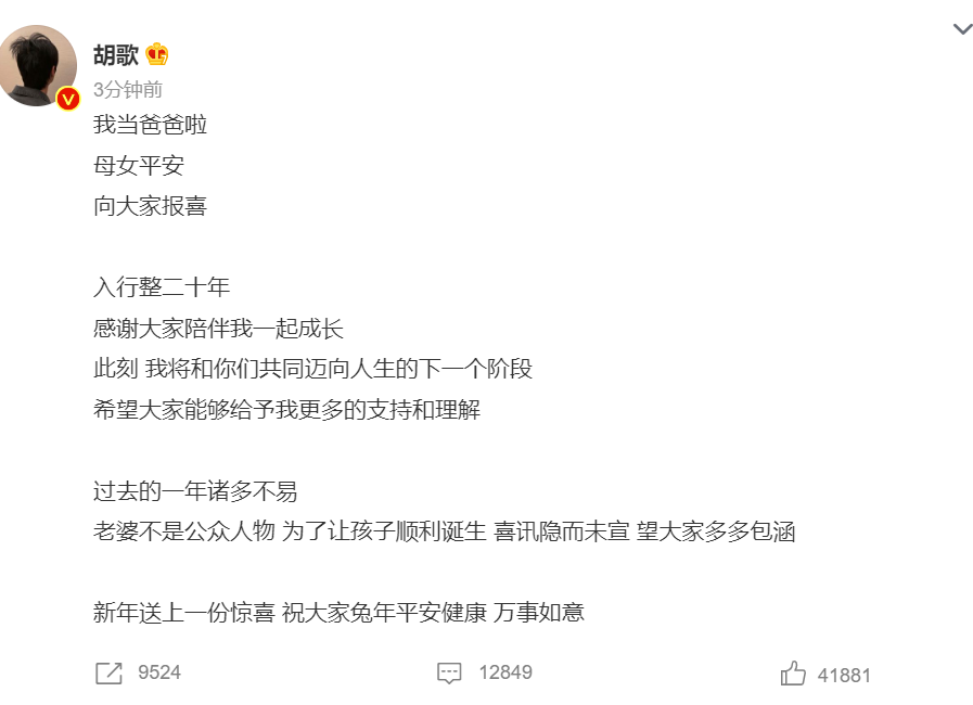兔年的第一个大瓜莫过于刚刚胡歌官宣当爸。