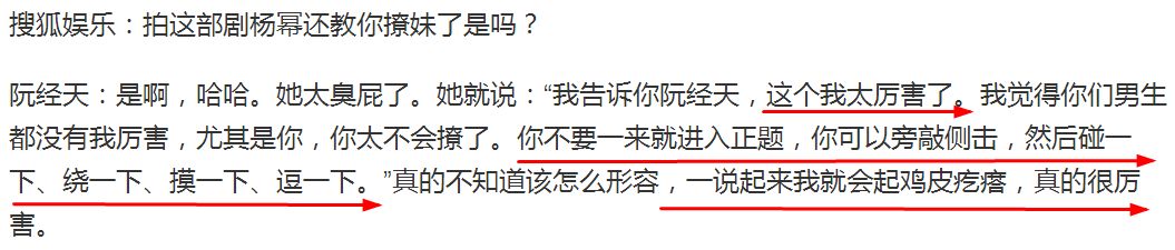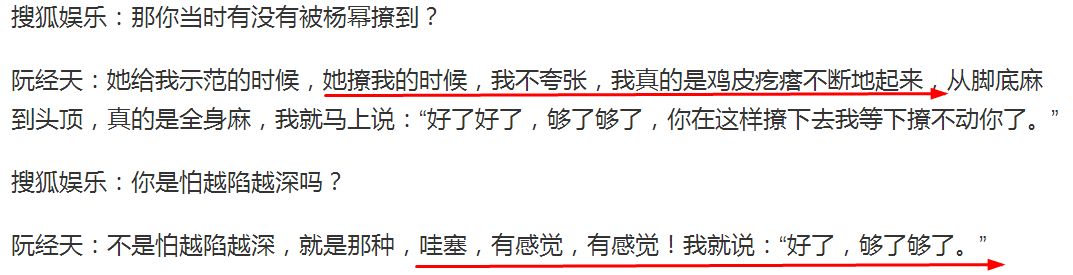 有一次阮经天被杨幂撩到起鸡皮疙瘩,立刻打住说:“够了够了”。