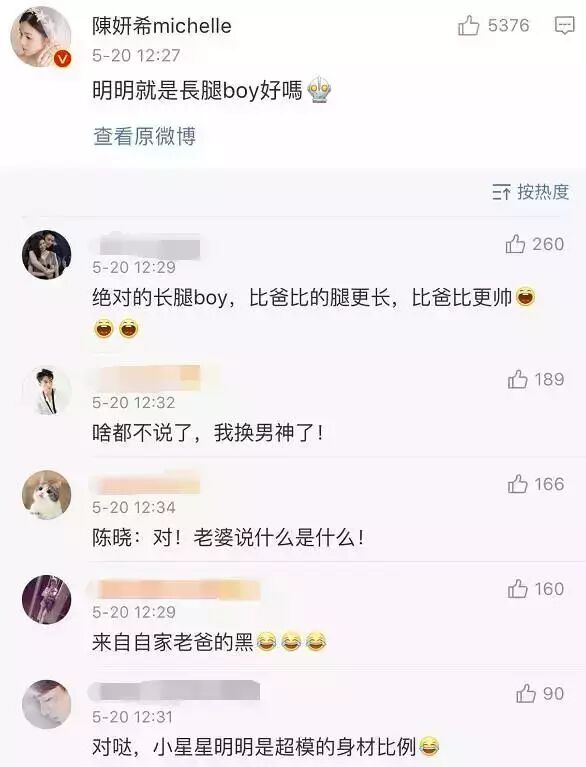 5.20的时候陈妍希po了小星星的背面照,陈晓在评论里黑儿子是二头身!