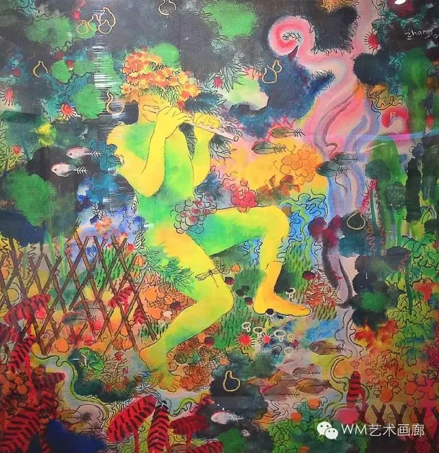 这幅作品为艺术家张国强先生《后吹笛人》纸上作品系列之重要作品之一。此作品有别与传统印象中的水墨作品,技法自由,色彩明快,更符合现代人的视觉经验。在中国丝绸上,以最新科技手段,按接近原作大小制作。