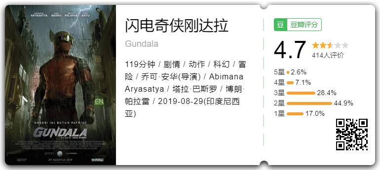 刚达拉不仅有闪电侠的外型、雷神索尔的威能、美国队长的领袖特质、以及V怪客的左翼精神,加上媲美叶问的刚猛动作与炫目的视觉效果,既接地气又有全球性。影片不仅创下高票房,导演、演员、技术与原创性,皆获好评,一举入围堪称印尼奥斯卡的芝特拉电影奖九项大奖。好吧,以上是官方介绍。这片西少做出来很久了,一直没看,朋友说很烂,所以一直没敢推,豆瓣上414个人给了4.7的分,不过,在IMDB上倒是有着6.5的评分。