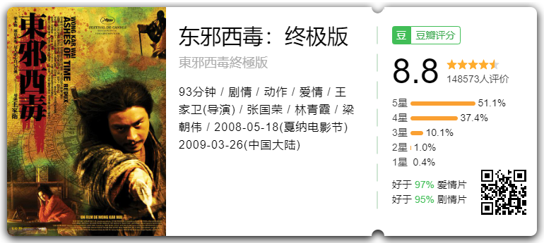 最近很想看一些老港片,比如哥哥,刘德华等人。也许这周,会推几部港片。当然,国产片还是咱们的禁区,仍然以海外影视为主。不要误会,只是突然想看哥哥了而已,而且,这是一部值得把每帧画面每行剧本都记下来的电影。本片其实是经过修复和重新剪辑的终极版《东邪西毒》,和94年版在画面、时长、配乐、标题、对白、镜头上都略有不同。