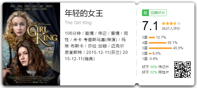 《年轻的女王》是由玛琳·布斯卡、莎拉·加顿等人主演的同性传记片,2015年上映。讲述了十七世纪的瑞典女王克里斯蒂娜·奥古斯塔传奇的一生。克里斯蒂娜女王对瑞典帝国的统治包括战争、宗教冲突、宫廷阴谋以及对社会进步政策的追求,她执政期间带领瑞典帝国走向文化繁荣。