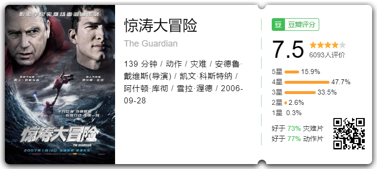 《惊涛大冒险》又名《海防最前线》,是由凯文·科斯特纳、艾什顿·库彻、雪拉·渥德主演的剧情灾难片,2006年上映。讲述了一支海上搜救队凭借惊人的毅力和无私的精神,用自己的生命与惊涛骇浪对抗,挽救他人生命的故事。