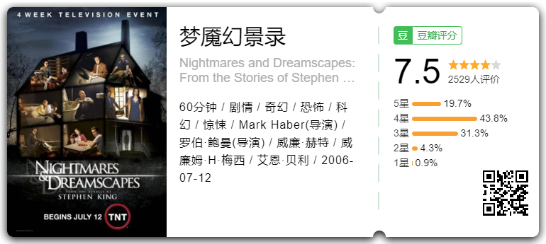 《梦魇幻景录》:其实就是《噩梦工厂》,根据著名惊悚小说家史蒂芬·金的短篇作品拍摄而成的8集迷你剧,史蒂芬本人担任编剧。