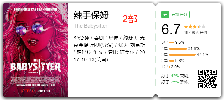 《辣手保姆》是由犹大·刘易斯、萨玛拉·维文、罗比·阿梅尔、汉娜·梅·李等主演的恐怖片,第一部2017年上线网飞,第二部上周刚出来。讲述男孩科尔对新来的性感保姆产生爱慕之情。可某日保姆将朋友带到家里来后,却触发了一系列残忍的虐杀活动(第一部)。