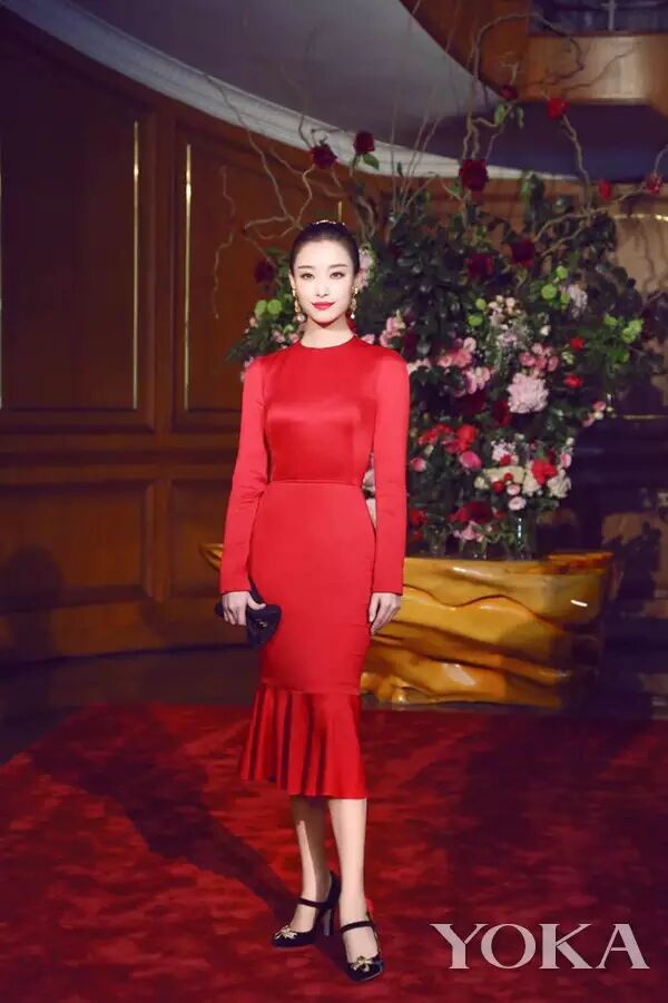 倪妮利落复古的发型搭配一袭鱼尾红裙端庄典雅,发髻上蝴蝶结与玫瑰点缀的高跟鞋相得益彰,华贵中不失可爱。