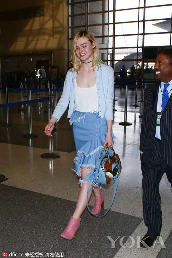 艾丽-范宁牛仔衬衫+荷叶边短裙抵达机场 粉色短靴配印花手袋可爱俏