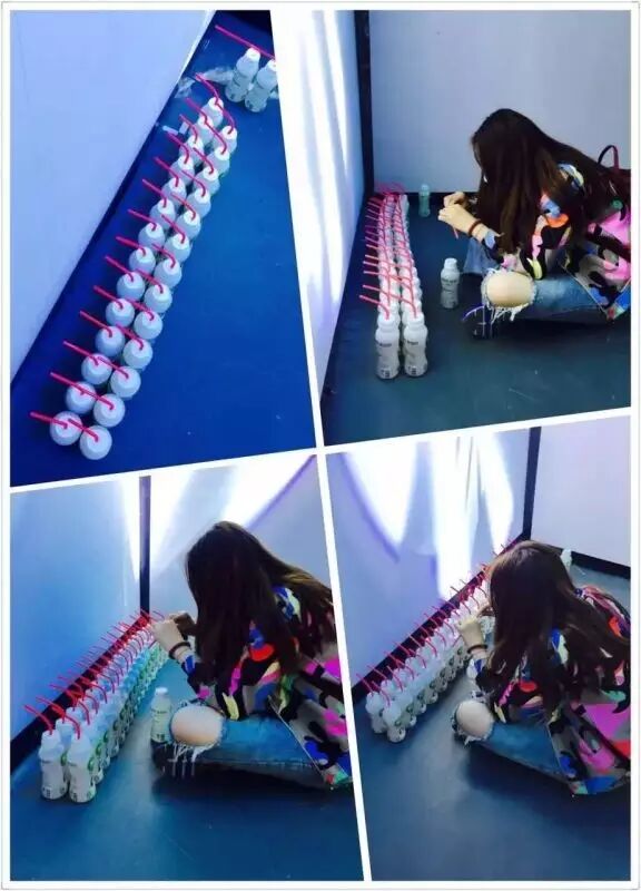 游戏中的重要道具瓶子,即植益乳酸菌的饮料瓶,游戏的需要是要在每个瓶子里插入吸管。导演们就不得不挨个儿钻孔插吸管,想想这也是耐心活儿呢。