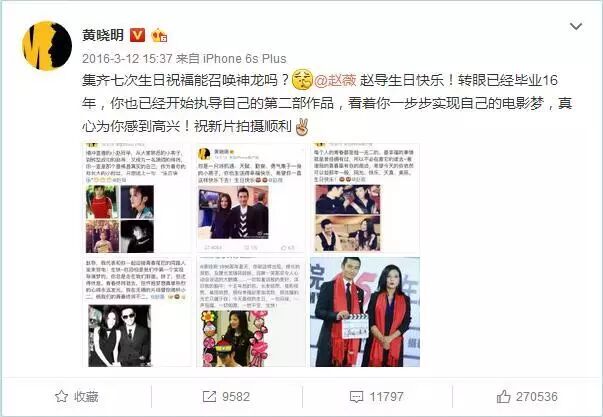 从2011年开始,每年赵薇的生日黄晓明都会在微博上写上一段话,情真意切的让人感动。2016年的时候黄晓明甚至在微博上调侃集齐七次生日祝福就能召唤神龙吗?可惜,黄晓明今年却似乎“忘记”了。