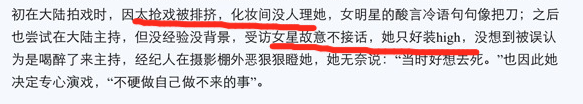 做综艺,因为她眼睛太大,很抢眼,在化妆间没人搭理。做嘉宾主持女演员故意不接她的话,无奈,只好自己装high。