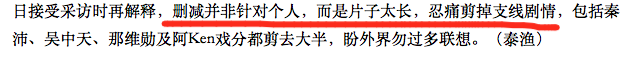 导演在接受采访的时候解释是:因为电影太长所以考虑到时间不得已剪掉!没有任何个人恩怨。