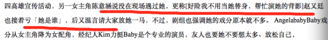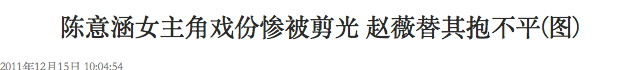 片方将陈意涵的戏份删除的一分不剩,女主变成了Angelababy,陈意涵变身 “零戏份”女主,一时沦为娱乐圈的笑话。陈意涵本人更是无法接受,留下沉重的心理阴影。