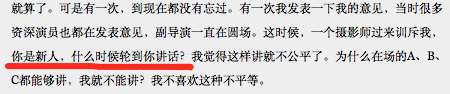 有一次剧组一群演员在一起讨论剧本,她表达了一下自己的想法,被摄影师点名指责:你是一个新人,什么时候轮到你说话。