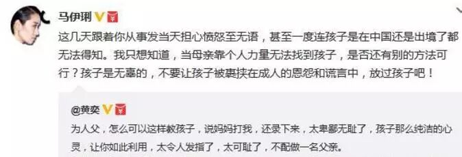 马伊琍称:“跟着你从事发当天担心愤怒至无语,甚至一度连孩子是在中国还是出境了都无法得知。我只想知道,当母亲靠个人力量无法找到孩子,是否还有别的方法可行?孩子是无辜的,不要让孩子被裹挟在成人的恩怨和谎言中,放过孩子吧!”不少网友也留言对马伊琍的态度表示支持。不过就在马伊琍发出第一条微博不久,她将内容删除,重新发了一条文字比较简短的微博称:“同为母亲,都希望孩子不要因成人的恩怨被裹挟在谎言里,孩子是无辜的,心疼孩子!”
