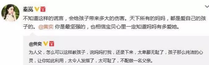 秦岚也转发黄奕微博,力挺她:“不知道这样的谎言,会给孩子带来多大的伤害。天下所有的妈妈,都是爱自己的孩子的。黄奕,你是最坚强的,也相信宝贝心里一定知道妈妈有多爱她。”