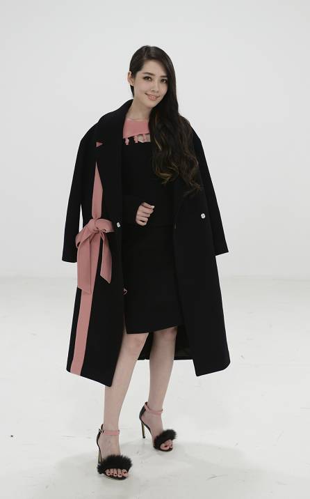 粉色与黑色结合翻领大衣+蝴蝶结元素