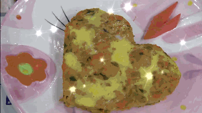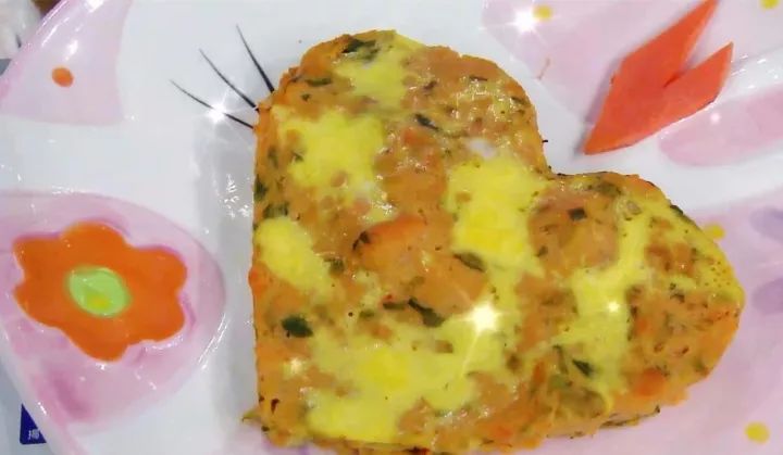 蒸熟拿出后晾凉,用模子做成心形,不用模子直接切小块也可以,这个蔬菜鸡蛋饼就做好啦!