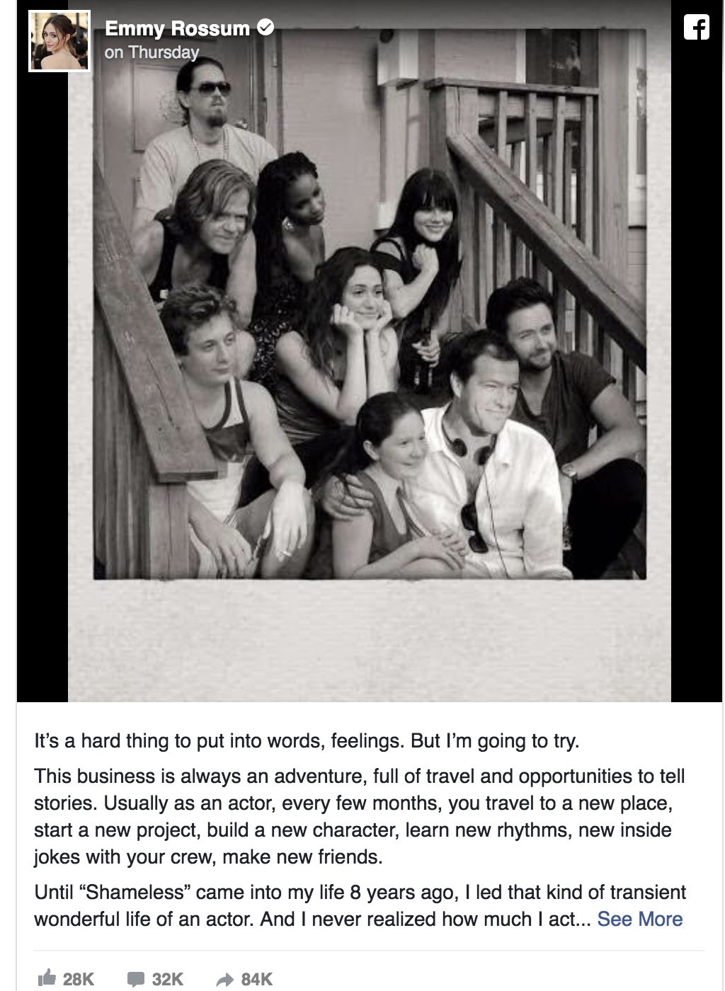 她也在Facebook的一则Po文中,晒出了自己和第一季的几位常规演员的合照(包括了“Mandy”还有“Jimmy),并且在长文中写下了自己对这八年的感动还有对同剧演员、主创以及电视网的由衷感谢;