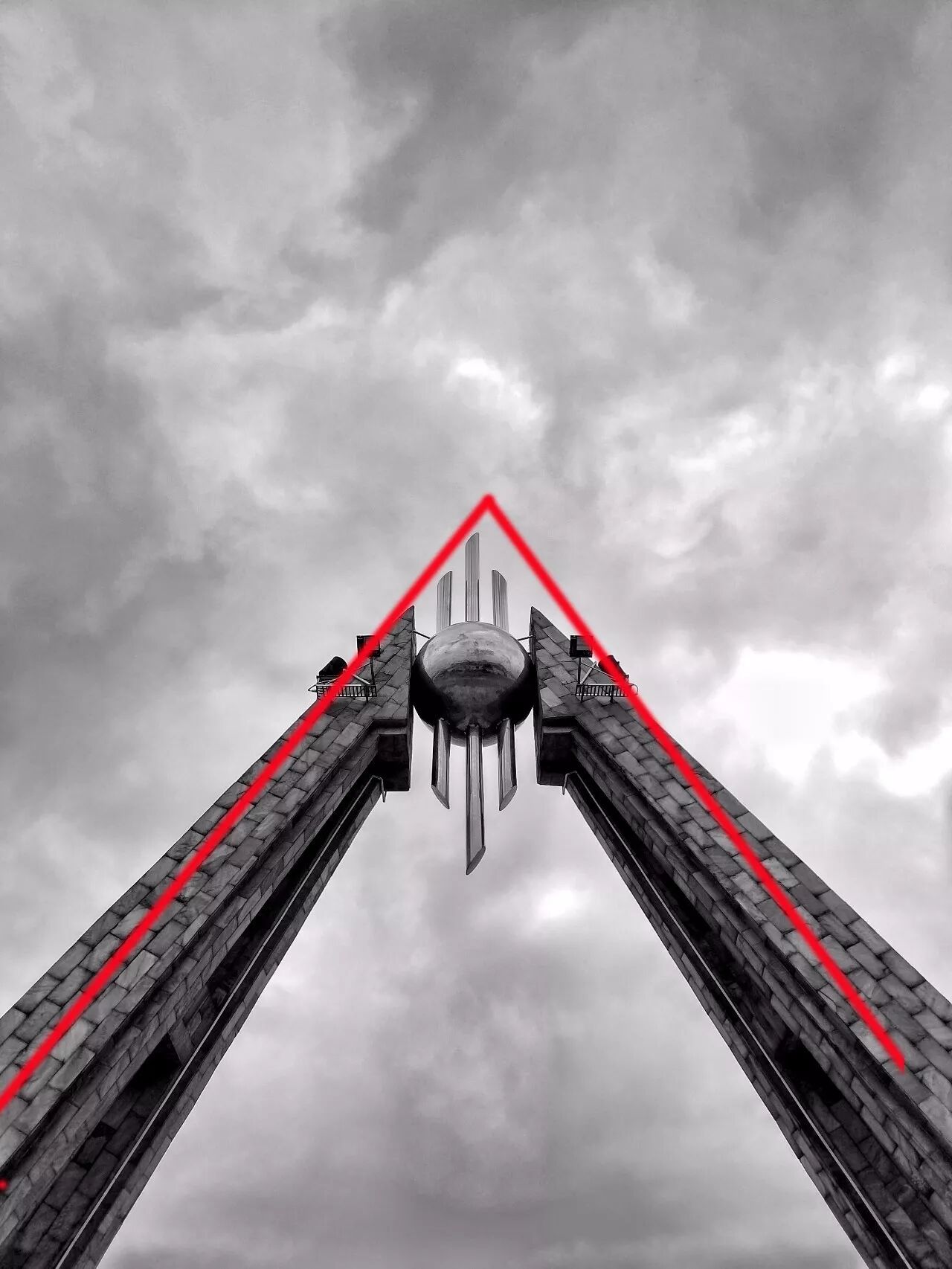 A字形构图具有极强的稳定感,向上的冲击力和强劲的视觉引导力,可表现高大自然的物体及自身所存在的这种形态。把表现对象放在A字顶端汇合处,是强制式的视觉引导,让观赏者想不注意这个点都不行。A字型构图在建筑和商品照片时候使用比较普遍。
