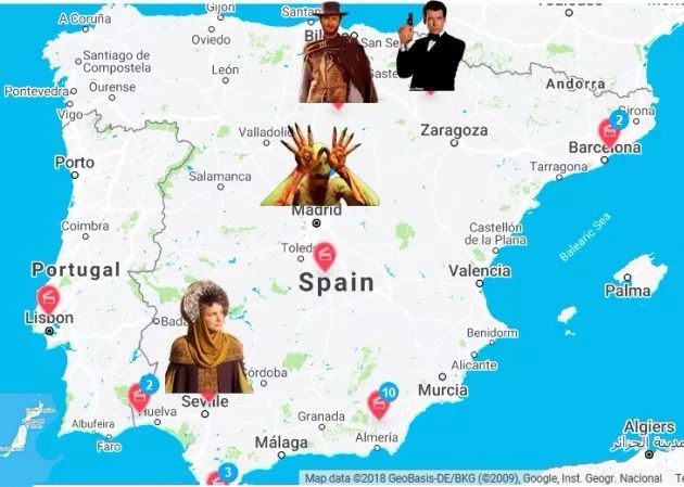 这张电影交互地图(mapa interactivo)上汇集了1950年代至今(desde la década de 1950 hasta la actualidad)的奥斯卡奖获奖影片以及过去30年的票房巨作(los grandes éxitos de taquilla),让我们把目光放到西班牙,看看哪些大片产生于此。