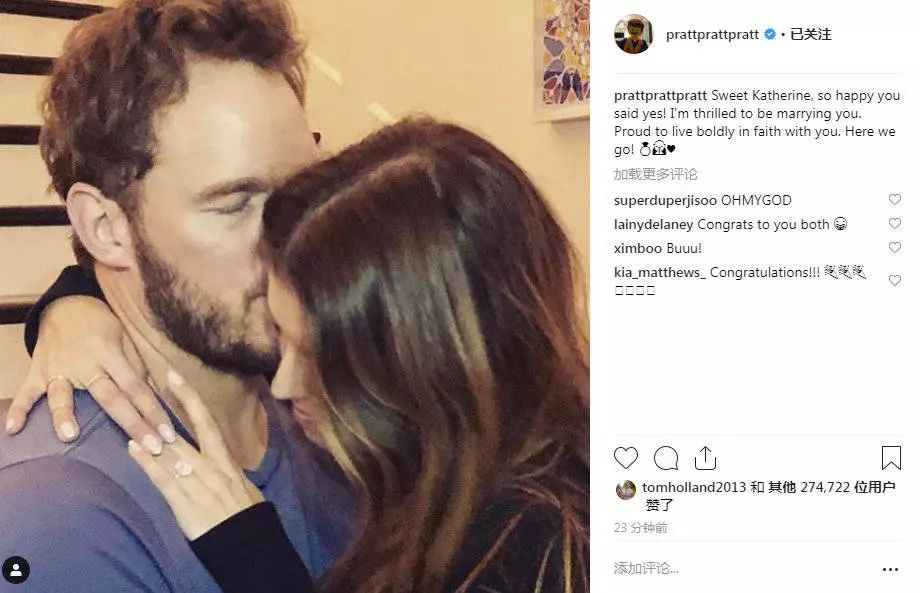 相恋半年后,今年1月,克里斯·帕拉特向凯瑟琳·施瓦辛格正式求婚,凯瑟琳说了yes。