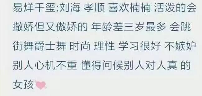 活泼的会撒娇但又傲娇的,理性(小娱翻译:也就是在千玺面前活泼会撒娇,在外人面前傲娇有骨气,理解千玺,不会胡思乱想)