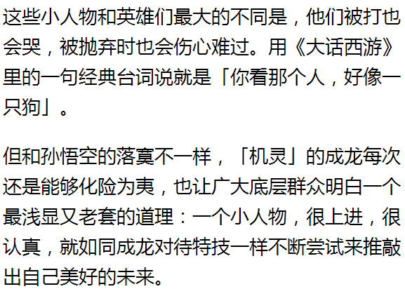他也把这种情怀带到了电影中。如果说李小龙是惊天动地的大英雄,那么成龙就是走街串巷的小英雄。