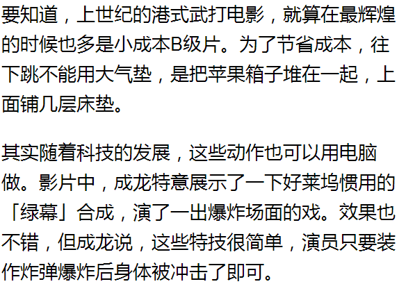 和其他好莱坞大片对比一下你会发现,成龙和那些满身疙瘩肉,靠晃镜头制造出的西方动作英雄不太一样。