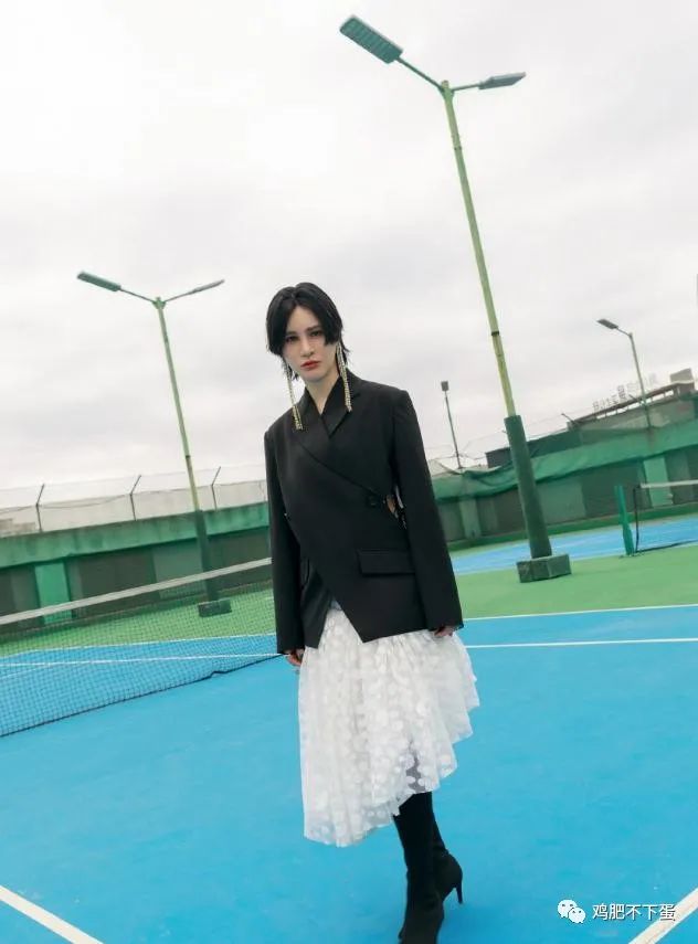 白纱裙的选择固然是很女性化的服装,而她那外搭上黑西装外套的穿法更是尚雯婕一直以来时尚审美的最好体现。
