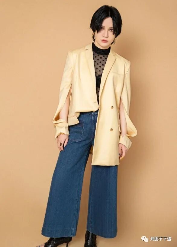 留意她所穿的这件西装外套仅是其中黄色系颜色额的选择就可以让她很轻松成为人群焦点,此外西装外套中存在的这不规则裁剪设计看着更是独特得不行。