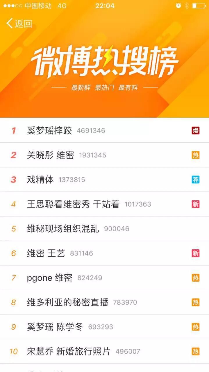 排在首位,引爆微博的,是在表演环节中,中国超模奚梦瑶不慎出现意外跌倒在台上,令人大呼惊险,替她捏了把汗。