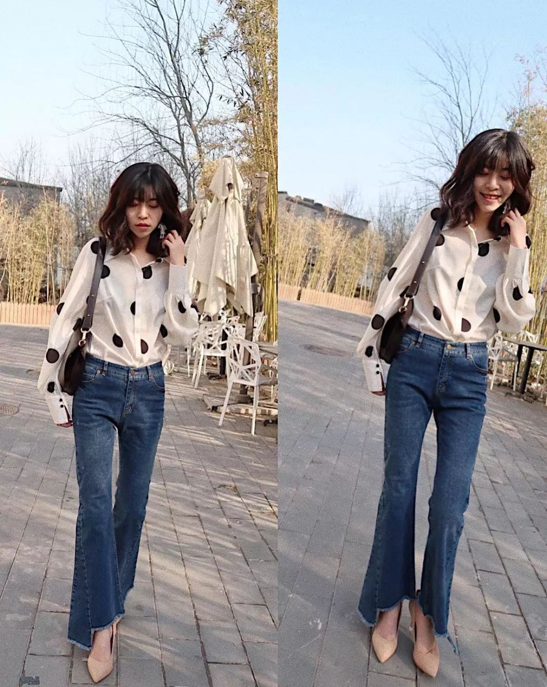波点衬衫加牛仔裤,足够时尚,也足够职业。