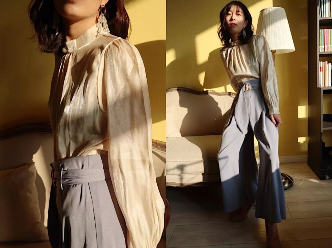 米白色丝绸衬衫➕天蓝垂身阔腿裤