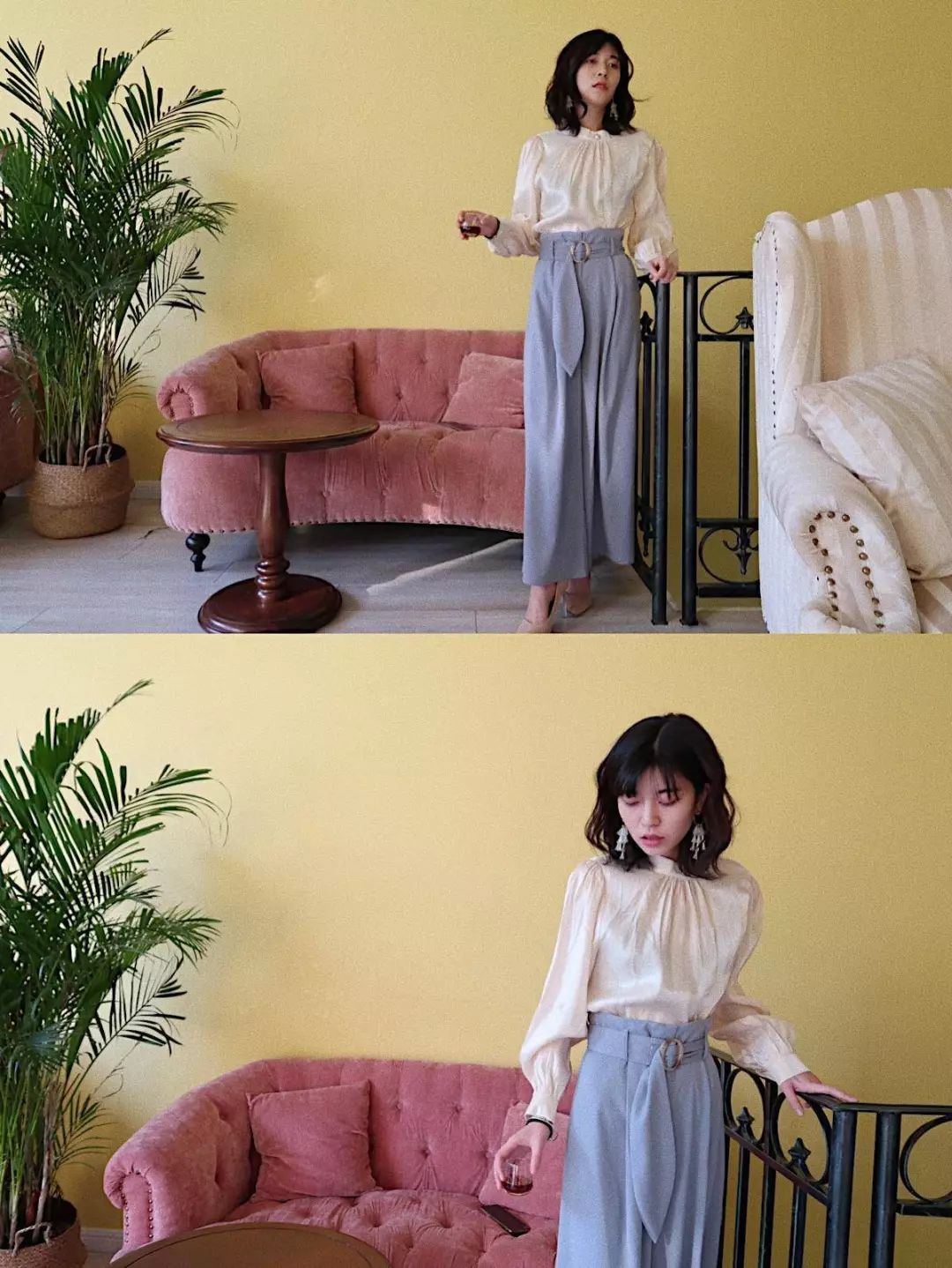 轻微泡泡袖,花边高领设计,上身就有一种复古宫廷的感觉,我唯一能想到的修饰词就是高级了。