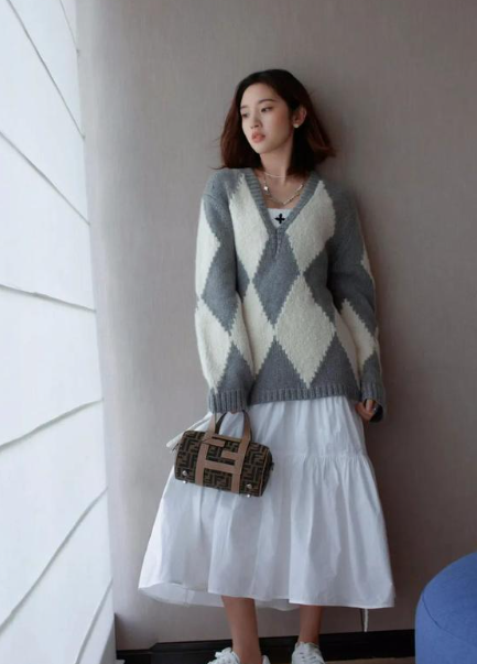 在这套搭配中,唐艺昕选择了一款白色不规则连衣裙,搭配了一件灰色拼接的V领毛衣。白色的连衣裙以其简单纯粹的颜色,展现出唐艺昕的干净利落,而灰色的V领毛衣则提供了一个温暖而舒适的外壳。项链的点缀使得整体造型更加细致完美。这套搭配既体现了唐艺昕简约的时尚品味,也展现了她的女性优雅。