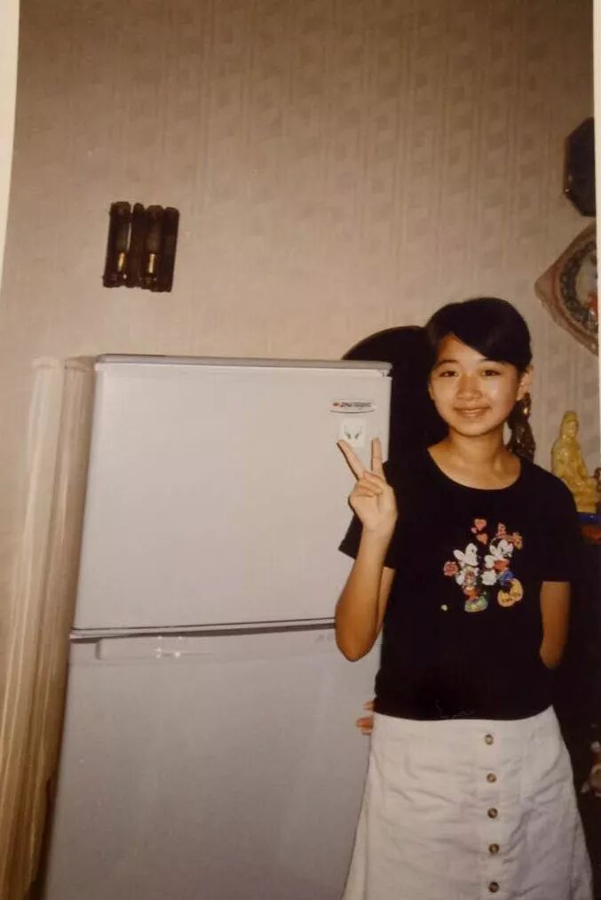 当年的自己像个男生一样。搞不懂自己当年的审美,跟一个破冰箱有什么好合影的?剪刀手到是在当年有点时髦的。
