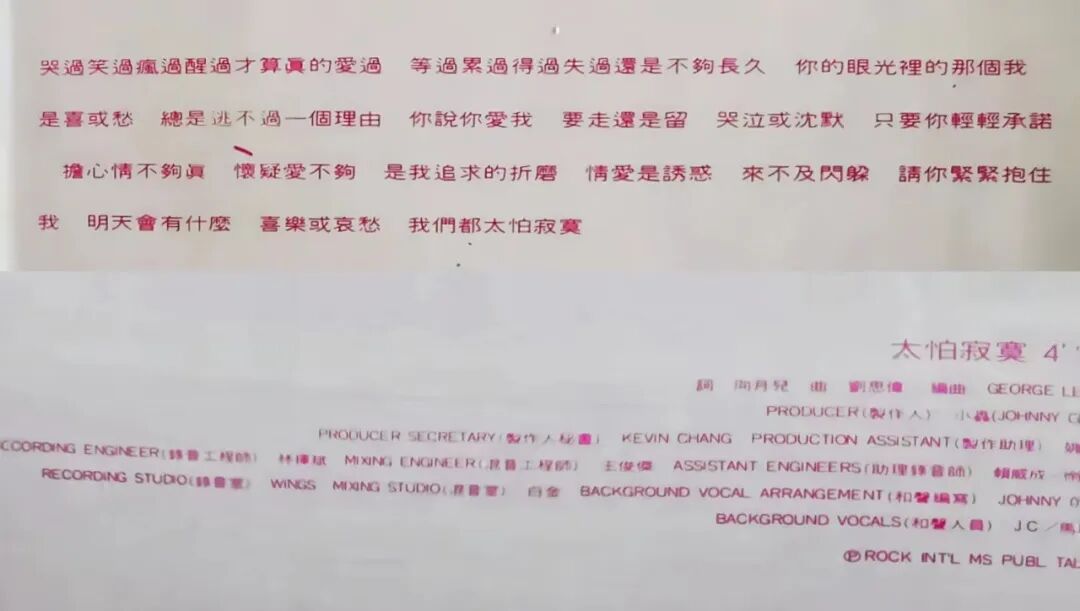 歌词《太怕寂寞》(上图)