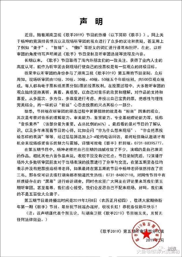 听审团部分代表发表声明:说明了节目组对听审团的筛选过程,尽量避免某个歌手的死忠粉到场,所以相对来说是公平公正的,都是对音乐有一定鉴赏能力的。