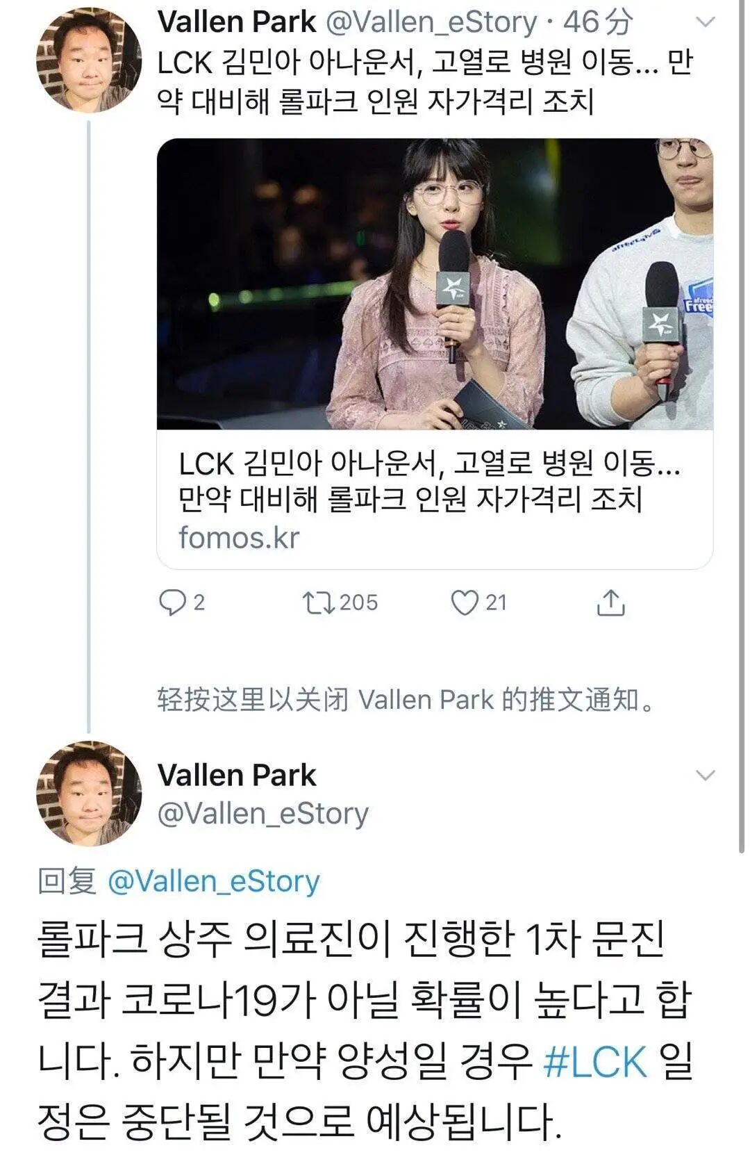 目前工作人员正在确认选手情况中,2月23日LOLPark的所有工作人员和记者今天工作结束后,在金玟我主持人检查结果出来前,全员进行自我隔离,具体情况我们将继续更新。