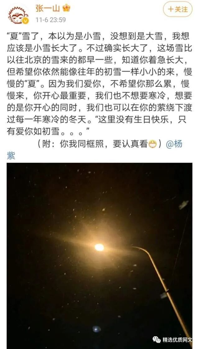 11月6日深夜,张一山在社交账号上卡点发长文祝福杨紫生日快乐。张一山结合北京下雪的场景,写了一段挺用心的祝福语。他希望杨紫能像往年的初雪一样小小的来,慢慢的夏。张一山还心疼杨紫不要那么累,慢慢来,开心最重要,并且表白爱你如初雪。还配了一张非常有讲究有含义的图片。