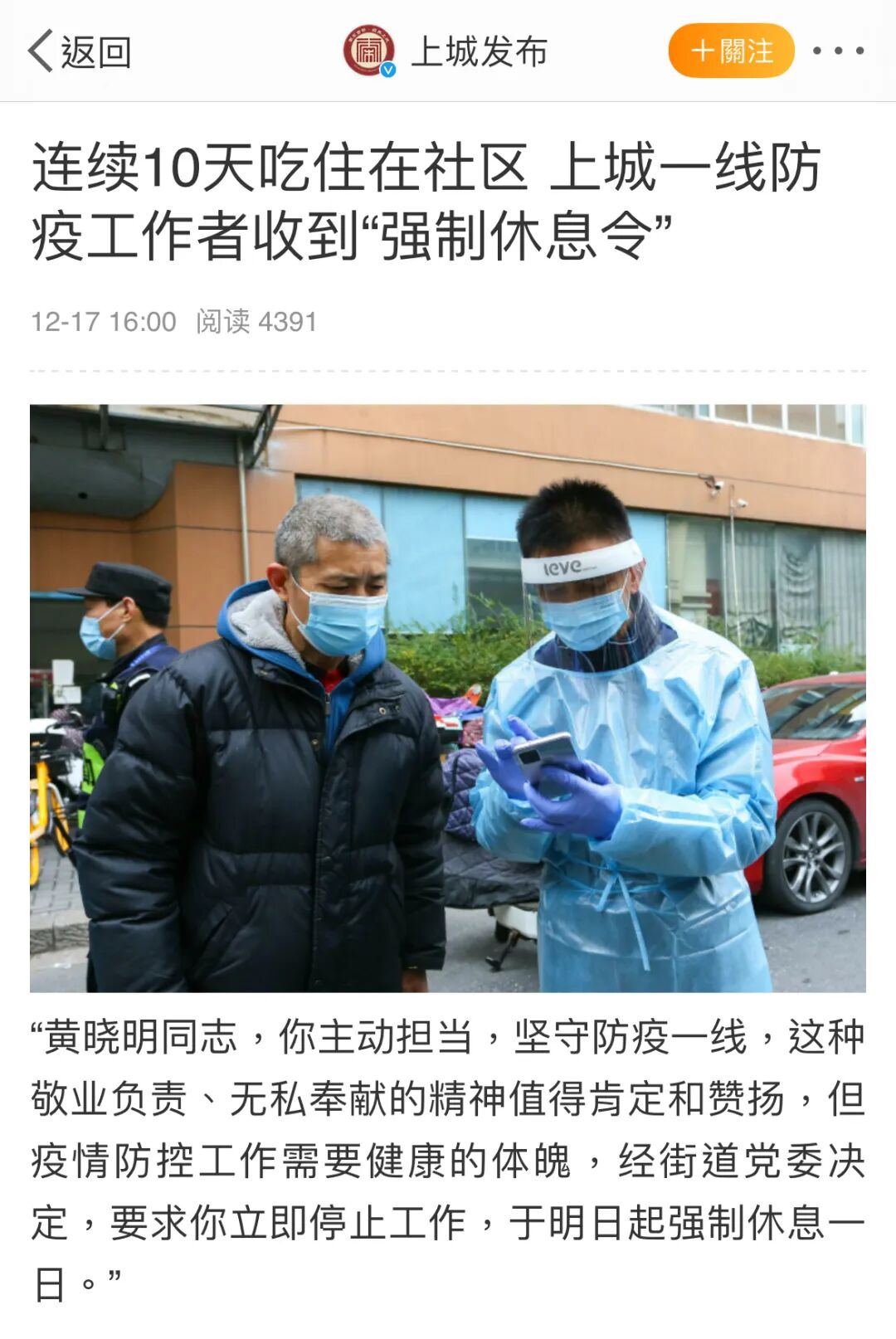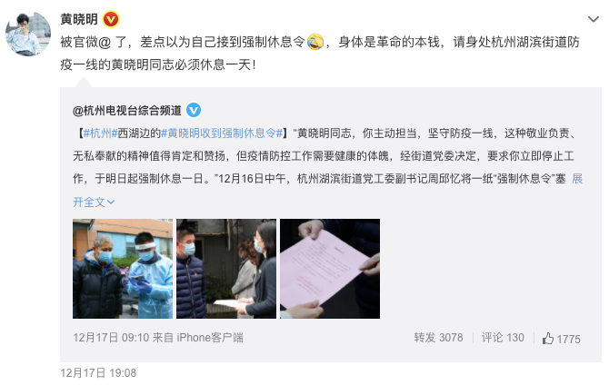 事情的真相是,身处杭州湖滨街道防疫一线的街道党工委委员、人武部长黄晓明接到了一张《强制休息令》。
