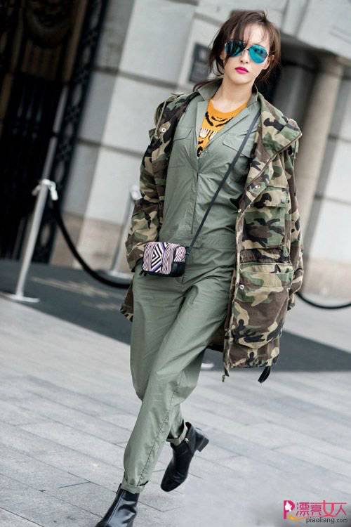 唐嫣在2016巴黎时装周期间的街拍曝光,风格百变,时而攻气十足,帅气迷人,时而扎起丸子头,演绎甜美少女风。这身迷彩外套配军绿色连体裤就尽显她的霸气总攻范儿。