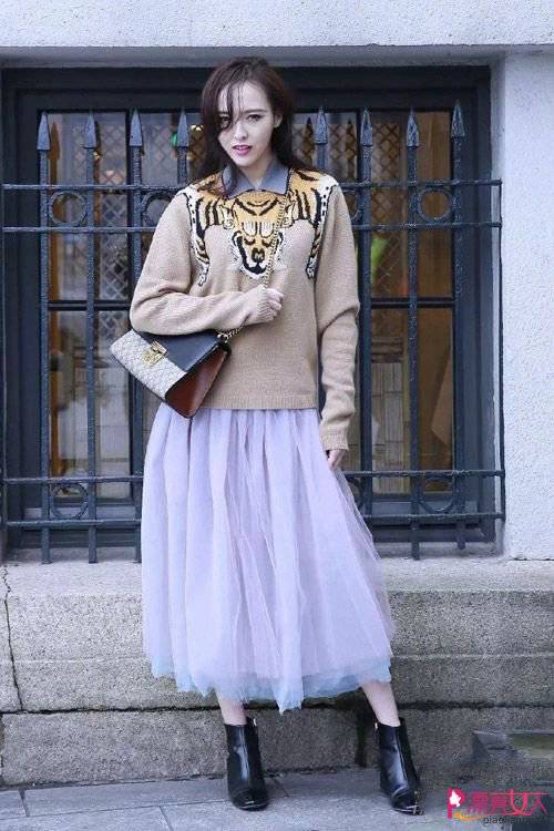 驼色针织衫加入老虎图案的设计,瞬间变得时髦又霸气,搭配浅紫色纱裙仙气十足,彰显梦幻与浪漫。